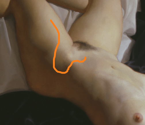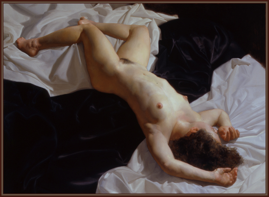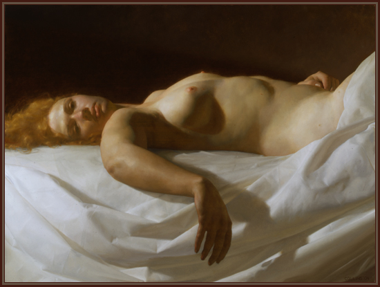 In the painting, Candace, Jacob is doing several impressive things. One is that the composition is powerfully divided between the light and dark of the fabrics, which is echoed by the high contrast of light and dark on her body. The modeling of her body is superb. Notice the form of her left thigh, how the form rotates up to the highlight on the iliac crest, and then gently descends onto the plain of her taught belly. Her flesh-tone color is natural, rich, and subtle. Notice the pinkish fingertips, the crisp pearl-color of her breasts, the cool blue mid-tone of her ribs, and the ochre highlights of her thighs.