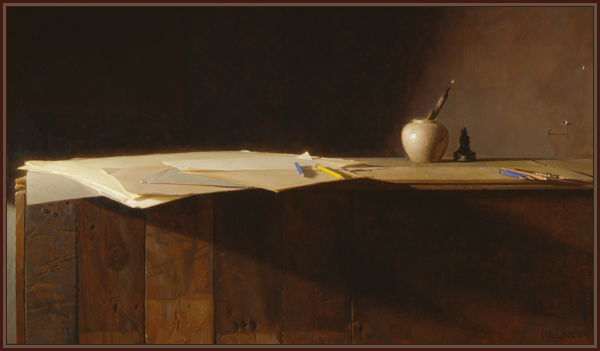Drawing is my favorite Collin’s painting. Spreading out in foreshortened perspective are the paper and tools for drawing. Even if you are not an artist, you might have experienced the joy in going into an art store and seeing and feeling the textures of the papers, looking at the pastels and charcoals, and wondering how much fun it would be to make art. Notice the different textures and subtle colors of the papers in Drawing. You might notice the highlighted, ruffled, and delicately torn edges of several of the papers. I have fond memories of learning about different papers as an art student. One lesson we learned was to tear a really good acid-free 100% cotton rag paper to size using a straight edge–it’s a very sensual experience. Collins gets that tactile beauty of the paper down exactly.