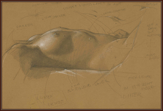 This drawing, a study for the painting Redhead, shows the light and dark on her body. In addition, Collins has made notations, commenting on how to further enhance the lights and darks. A painter that is working with light has one enormous obstacle to overcome: light in real life is about a hundred times brighter than the re-creation of light with paint and canvas. An artist, through paint, can’t very well shine a 500-watt halogen light in your face! One way an artist simulates light is to show the reflection of light on objects. Think of the Moon in relationship to the Sun. Another thing that an artist can do, and which Jacob has done, is to fine tune the nuances of light to the nth degree. Compare the different tones of highlights of her forehead, breast, and thigh. Once viewers have adjusted their eyes to a painting that has a great range of nuance between light and dark, their eyes will feel the brightness of the light.