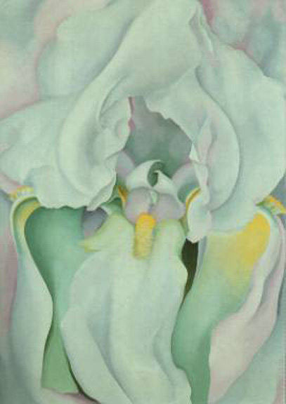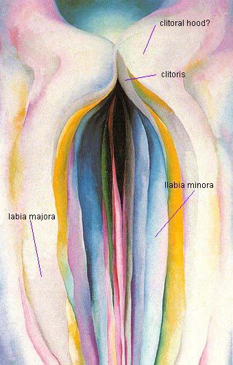 Continuing with another O’Keeffe painting, notice that there are no sharp vertical lines here. Rather, there are organic, fluid shapes and outlines. These shapes are easy metaphors for the soft lips of the labia and the yellow bud serves for the small erectile body of the clitoris.