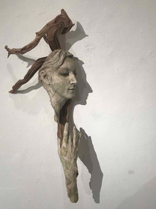 It is not a show to be entertained by or to be blown away by, it is not a social event nor does it give you prestigious points–it is a quiet pilgrimage for the health and well-being of your soul. Ragir has picked up pieces of broken concrete, wood, and leaves merging them with sections of the female figure molded in ceramic clay creating one-of-a-kind pieces.