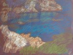 The view of the church had meaning to her, but it had no light, no color, and a dull background. But turning and facing the other way was a spectacular view of the landscape and sea beyond. There was no way to explain to her that I was following a different and special path. A little delayed, I now started my trip in earnest. This time carefully seated on the scooter I drove it towards beautiful pockets of land and seascapes. Once I found a spot that spoke to me I would draw it feverishly as fast as I could, after finishing it I would spray it with fixative, shield it with glassine, and carefully pack it in the portfolio, get back on the bike and continue to follow the light to find another wonderful spot to draw. At the end of the day the experience left me with a sense of zest in every fiber of my mind and body.