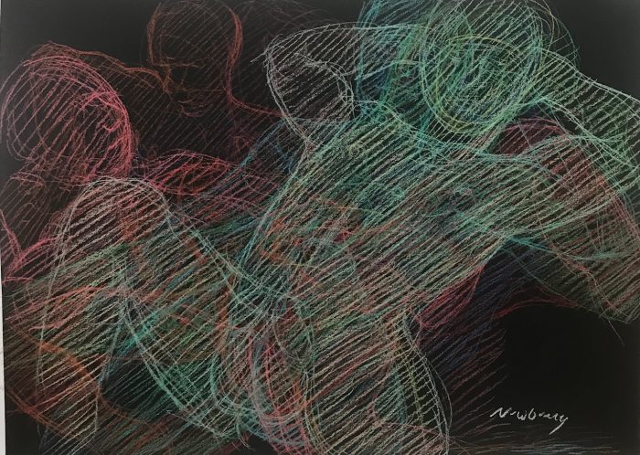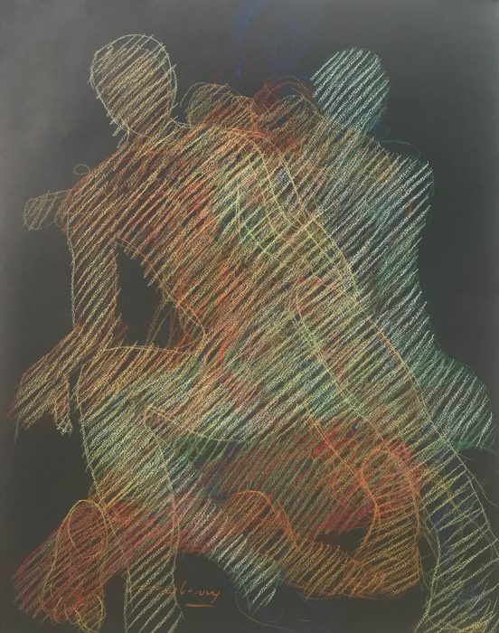 Recent overlaid pastel figurative drawings. Reminiscent of Duchamp‘s Nude Descending a Staircase, though overlaid figurative drawings have been around since Chauvet Cave painters.