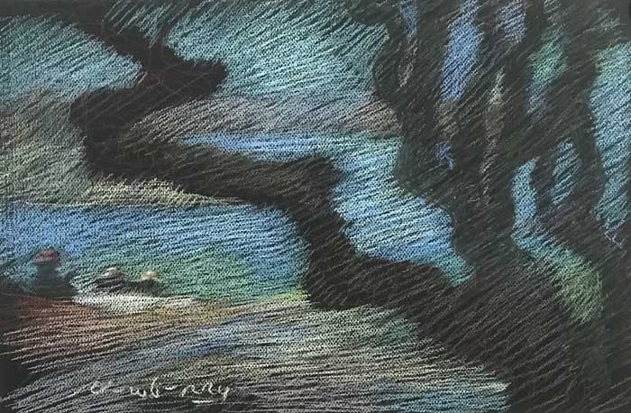 I don’t discuss my compositions (the arrangement of things on the 2d surface) often, but I love composing. My two aims are: to make if feel so natural you don’t even notice it; and to craft it with an eye towards symbolism. It seems I compose mostly by veto, when I reject most of the options I am left with something natural. Her my family is sitting in the light, thoughtful (the reader), and bonding. The dark tree is a little like the dark forest in Snow White — a little too personal, but like most family’s we have had are share of tragedy. My choice of subject matter also changes with how much time goes into the work, this was about an hour making and 1/2 hour editing. If I were to spend one year painting my family, I would make them much bigger and the tree much smaller — because all four of us overcame lots of obstacles to be really good people.