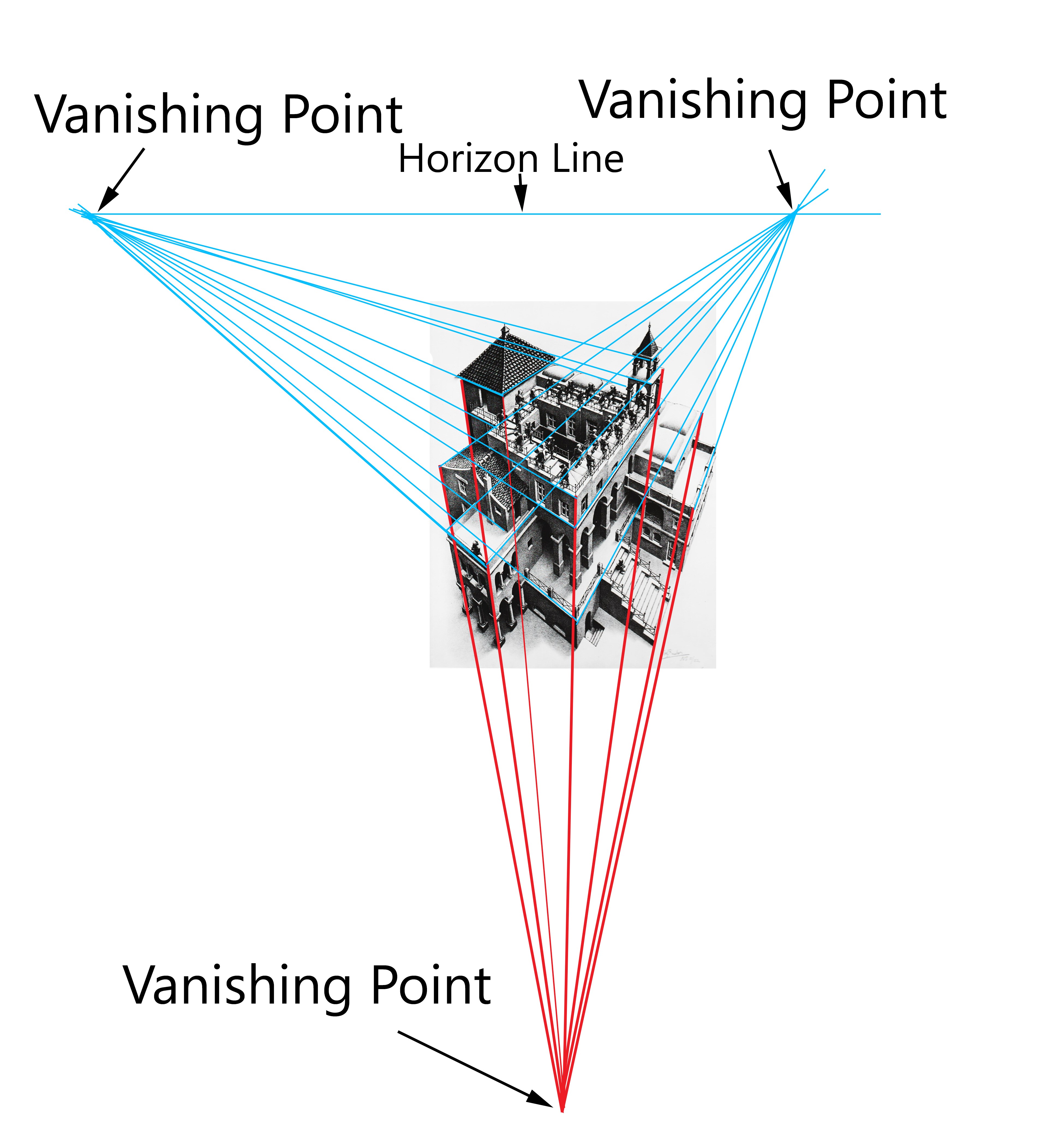In three-point perspective, the third vanishing point pulls all the verticals together at the vanishing point. In reality, we see three-point perspective more often than we realize, such as when seeing tall buildings or looking down at our stoves. The top of the stove’s surface will be broader than its base, which is further away from our eye level. M. C. Escher’s wonderful etching of a palace is a perfect example of three-point perspective. It’s easier to see with the help of a diagram and my markup showing how the vanishing points line up.