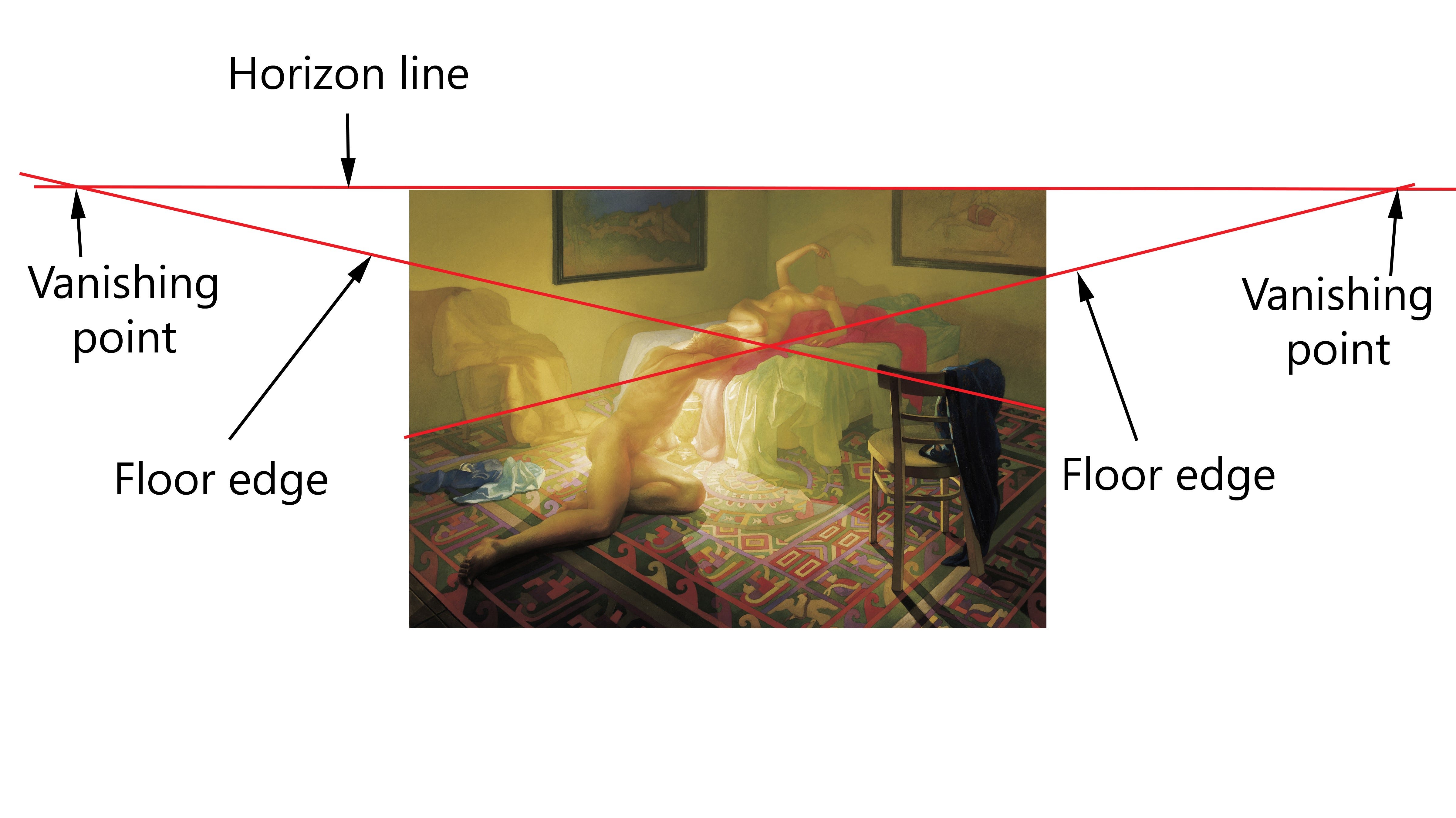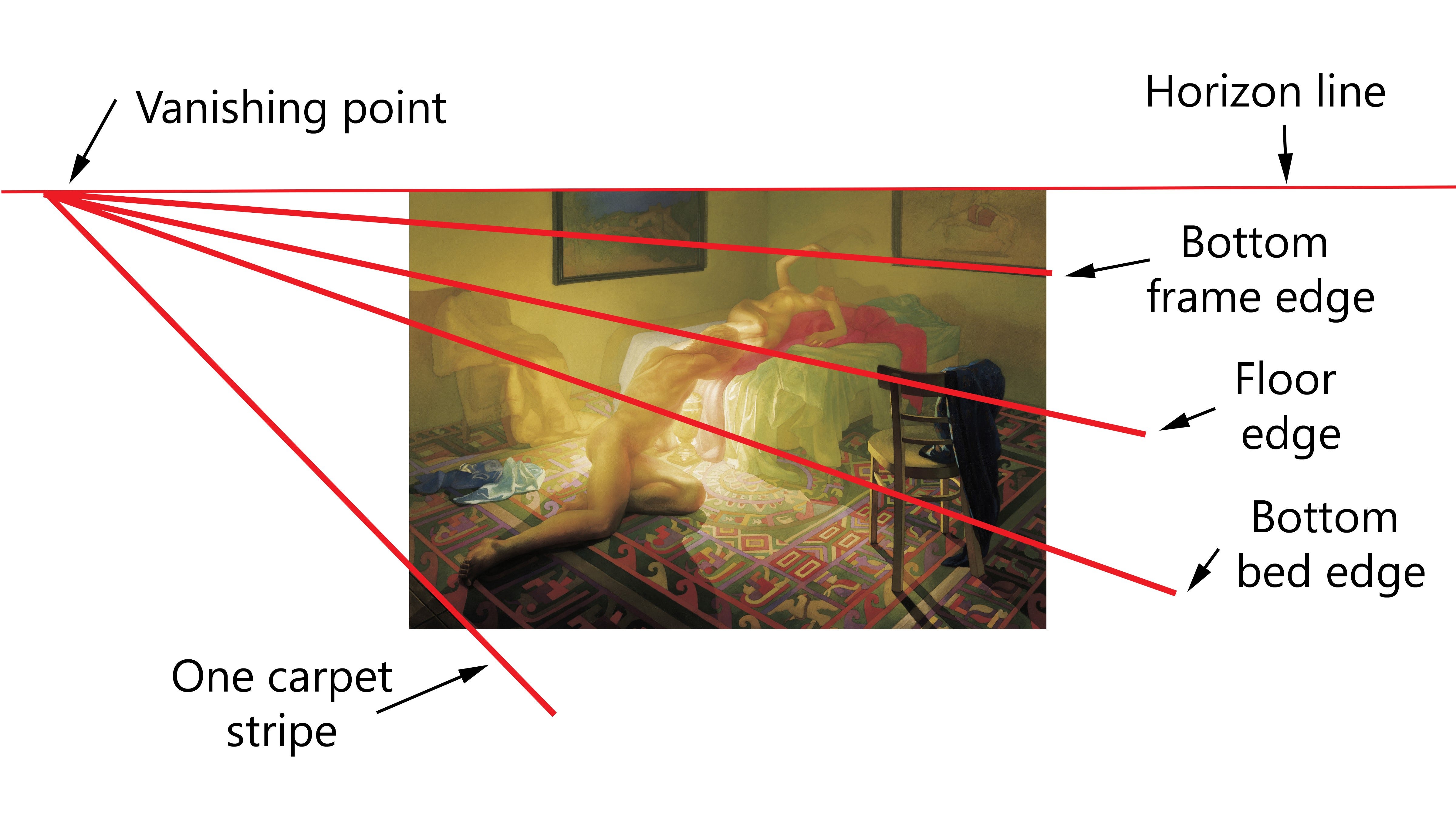The bed’s edges, the carpet’s stripes, the floor’s edges, and the bottoms of the frames all share one of the two vanishing points.