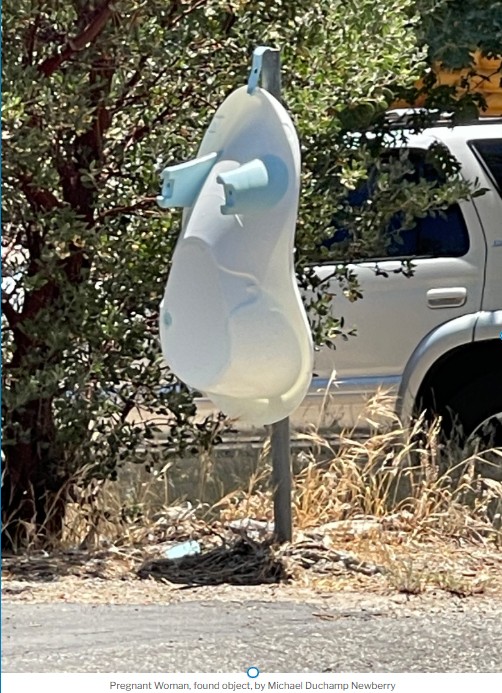 Yesterday, I was driving the five minute rural road from my mountain studio to our village. I was on the way to get Zoom Spout Oiler, because I choose a 90 degree August day to reenergize the rotating fan blades of my bathroom’s vintage heater. Successfully, I might add. Along the way, on the side of the road suspended by a pole was this white plastic white-shaped object that resembled an abstract torso of a pregnant woman. After passing it I looked through the rearview mirror to see its backside and recognized that it was a toddler’s bathtub. Bang! Several postmodern aesthetic patterns all smashed together in my head.