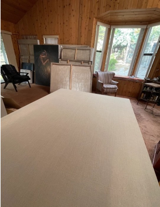 Just stretched the Belgian raw linen on my home-made stretcher bars for my next space painting. Will gesso it tonight.
