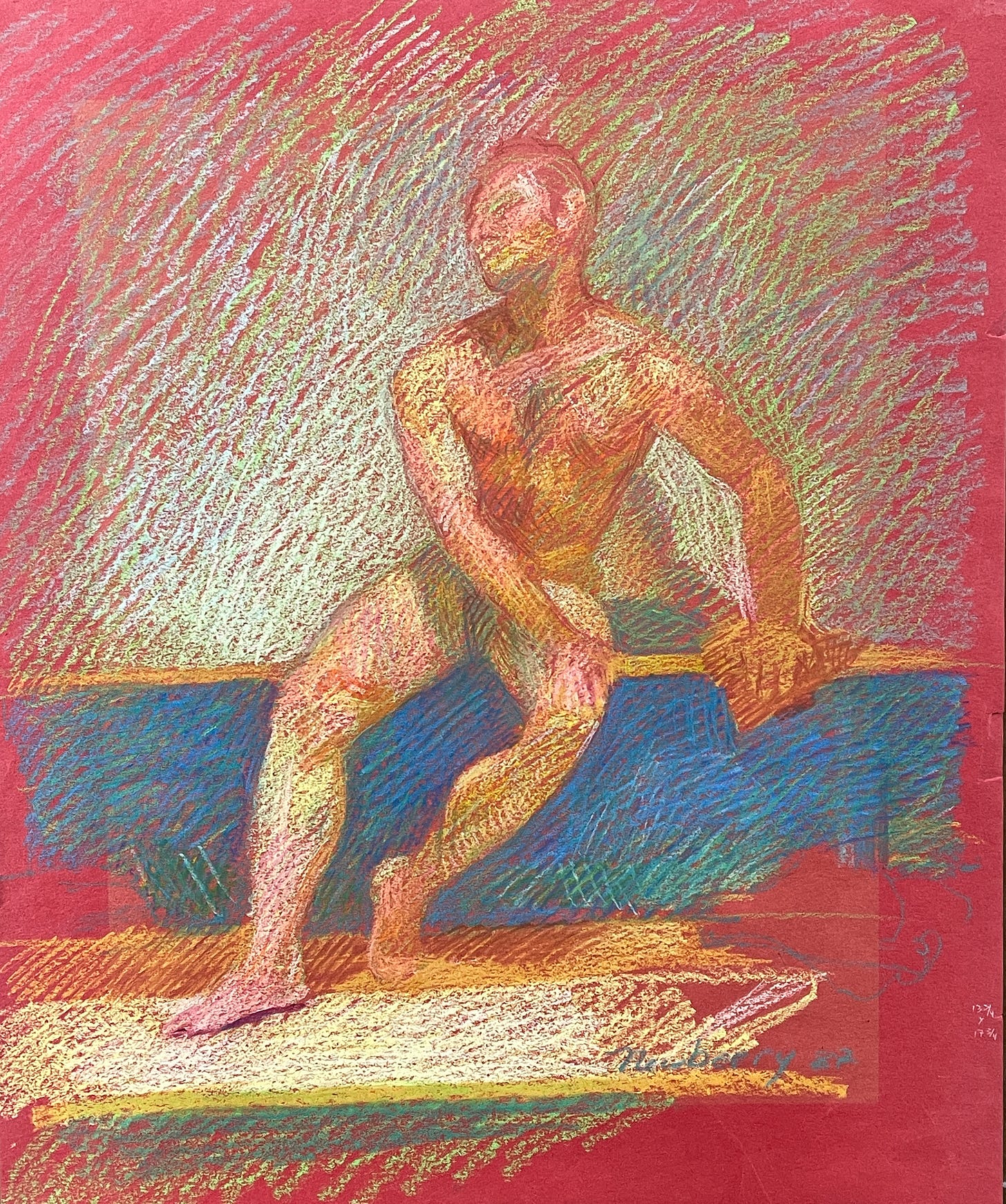 If I unpack the drawing on the red paper, it’s a fascinating problem because, actually, instead of making up any of the colors, I was drawing the color vibrations that I saw, going from the general to the specific with more time. The figure drawing was a three hour life drawing session. But as soon as you put a color on the red paper, something dynamic happens.