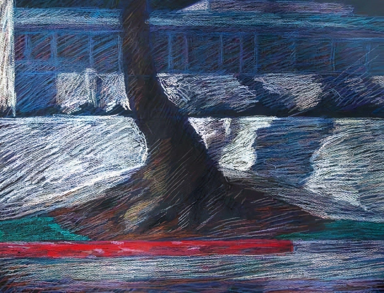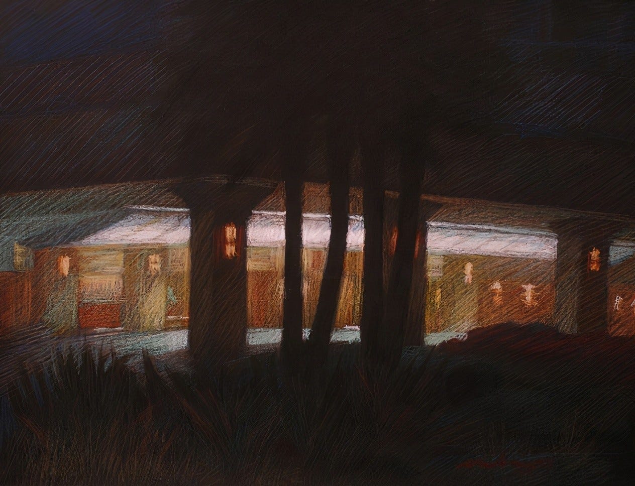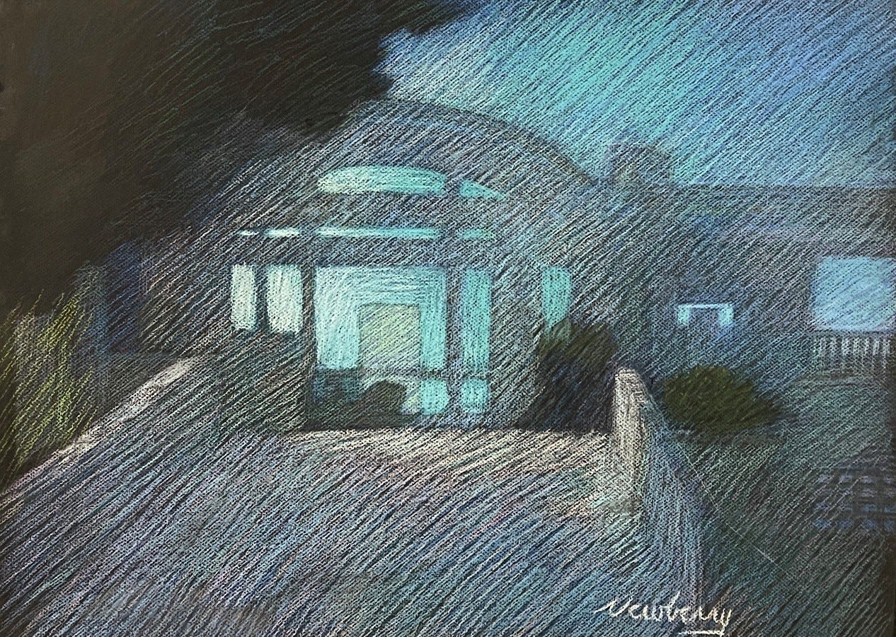 I especially enjoyed drawing the last two nocturnal pastels that were done just a couple of blocks away. I set up my French easel and used my portfolio folder as a drawing board, with the pastel paper clipped to it and my box of pastels precariously balanced on the easel’s tray. I drew standing under the light of a street lamp, with the advantage that the lamplight and the lobby lights were consistent, unlike the rotating sun. I lost track of time on each pastel, easily spending more than three hours on each one, calmly working until they were resolved.