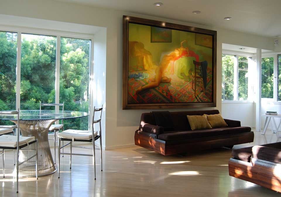Nancy was familiar with the painting and its story. After having eaten a wonderful dinner there with a centered view of the painting, Nancy expressed interest in acquiring Denouement. We agreed on the terms, and then a few weeks later we rented a truck, drove to Laguna Beach from Santa Monica, and relocated the painting to her place. After she acquired the work, my former art student and architect Andrew Obermeyer designed her living room around the painting, making it the third time a space was custom-designed around Denouement.