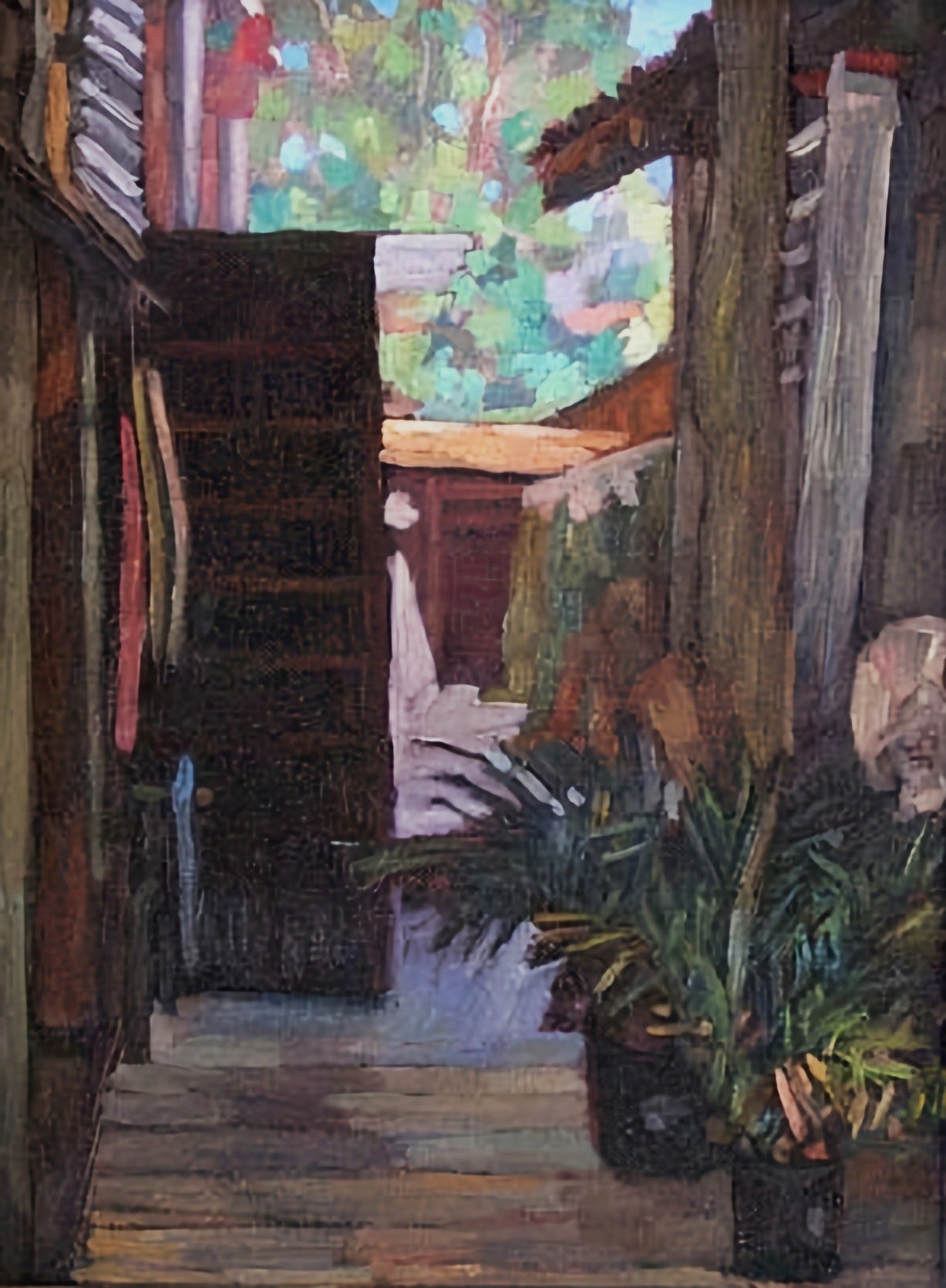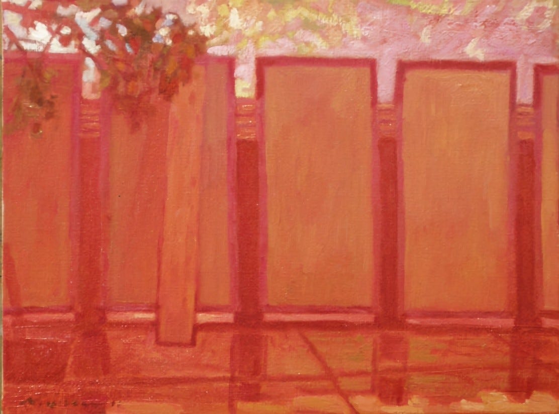 I was riding my bike from Nancy Frey’s compound at the bottom of the hill, where I was living, and heading to my art studio-gallery a mile away on Colorado Boulevard, the same street that runs into the Santa Monica Pier. Along the way, I passed a golden apartment building, and I always enjoyed seeing the palm tree’s shadow cast on the front of the building (Palm in Red). As I continued on, my thoughts turned to the lesson I was about to give to Chan Luu, the famous international designer who was studying with me privately.