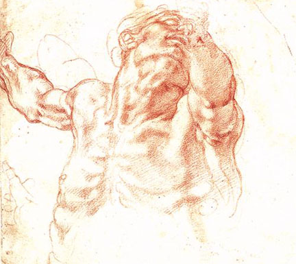 Michelangelo, Study of Haman for the Sistine Chapel, 1511, red chalk. Michelangelo, Study of Haman for the Sistine Chapel, 1511, red chalk.